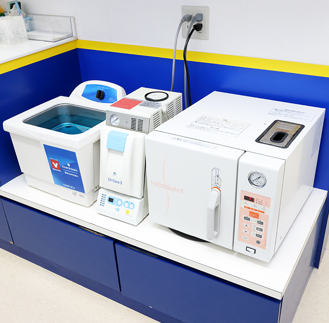 当院では、安心して治療を受けていただくために徹底した衛生管理を行っております。 治療器具類は使い捨て製品または洗浄・滅菌処理を施したものを使用しています。 また、空気清浄機を導入し清潔な院内環境を保つよう努めています。