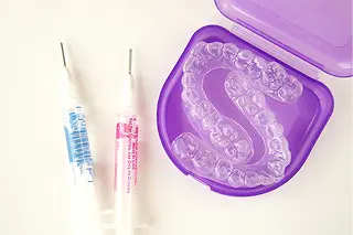 ご自宅で、ご自身にて行うホワイトニング方法です。マウスピースに薬剤を入れ、歯に装着したまま数時間おいていただきます。自分のペースに合わせて使用でき、薬剤の濃度も低く沁みにくいですが、白さを実感するには回数と時間が必要です。じっくり時間をかけて薬剤が浸透する為、白さが長持ちしやすいです。