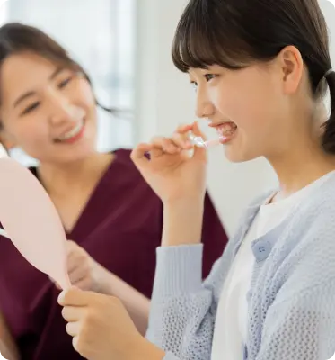 予防をしていく上で一番大切なのは普段のご自身でのブラッシングです。セルフケアがおろそかになってしまうと虫歯や歯周病の予防はできません。実は正しい方法でブラッシングができている方は多くありません。 一人一人お口の状態は異なる為、自分に合ったブラッシングを行うことが必要です。歯ブラシだけではなく、歯間ブラシやデンタルフロスを併用し、隈なく汚れを取りましょう。当院では歯科衛生士が皆様のお口の状態にあったブラッシング方法を指導いたします。