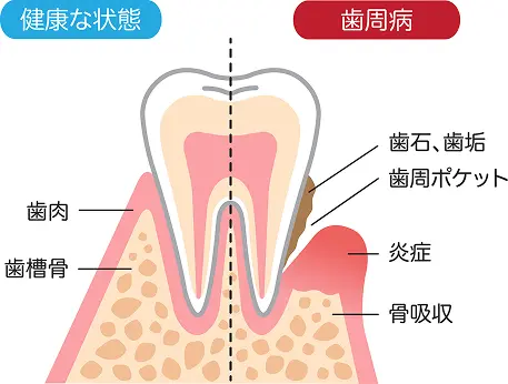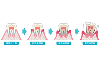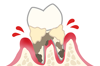 歯周病は、成人の約8割がかかっていると言われています。 虫歯と並んで歯を失う原因となる為、思い当たる症状があればすぐに検査しましょう。 ・ 歯がグラグラする ・ 口臭が気になる ・ 歯茎に腫れがある ・ 歯磨き後に血が混ざることがある 歯周病は細菌の感染によって歯茎や、歯を支える骨が溶けてしまう病気です。 痛みなどの自覚症状がないまま進行し、最終的には歯が抜けてしまうこともある為、日頃から予防をしていくことが大事です。 歯茎の出血を伴う歯肉炎を引き起こし、悪化すると歯を支える骨に影響を及ぼす歯周炎となります。 進行度によって、軽度・中度・重度に分けられる為、自分がどの段階なのか把握し、適切な治療を行いましょう。
