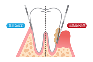 目盛り付きの「プローブ」という器具で、歯と歯茎の間にある溝の深さを測定します。ポケットが深いほど、歯茎の炎症や骨の破壊が進んでいる可能性が高いと考えられます。